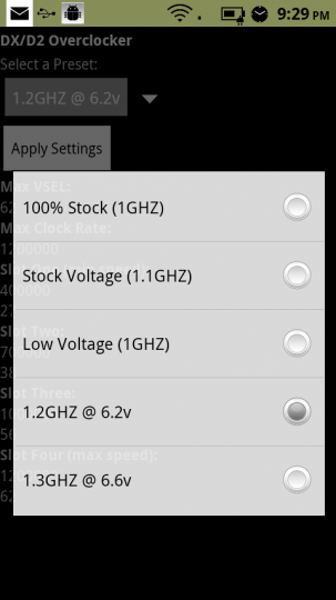 The app gives you easy-to-choose five different options; playing with the voltage and the clock speed of your Droid processor. It allows you to push the limits up to 1.3GHz at 6.6V (but no more, seriously you wanna burn out your device?). Although I never met a single Droid user who felt the need to overclock his phone, still playing with actual hardware is always fun. You need to have at least Android version 2.2 to run this app. They app (DX/D2 Overclocker) is available in Android market for $0.99